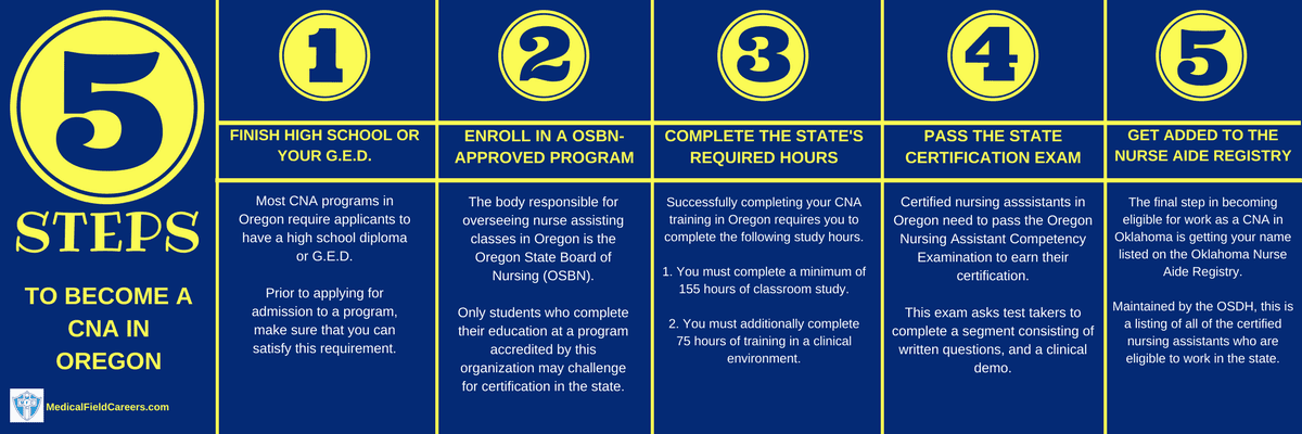 The State of Oregon requires you to finish 155 hours in class and an additional 75 hours of hands-on clinical training. You aren’t going to be considered eligible to take the state’s certification test (the Oregon Nursing Assistant Competency Examination) unless you have satisfied this prerequisite.