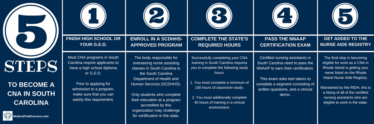 The second step to fulfill after meeting all requirements for your training, you will have to attend a CNA program in South Carolina accredited by the South Carolina Department of Health and Human Services. Once you have done so you can test for a CNA license in South Carolina. Programs and class sites that are approved by the SCDHHS are listed below.