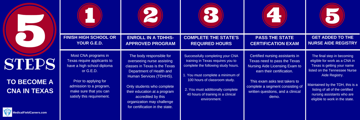 Currently in Texas there are not any minimum education requirements for becoming a Texas CNA. The only requirements there are currently are to pass a criminal background check and that they are not on the (EMR) Employee Misconduct Registry or that they have a “Revoked” Status in the Texas Nurse Aide Registry.