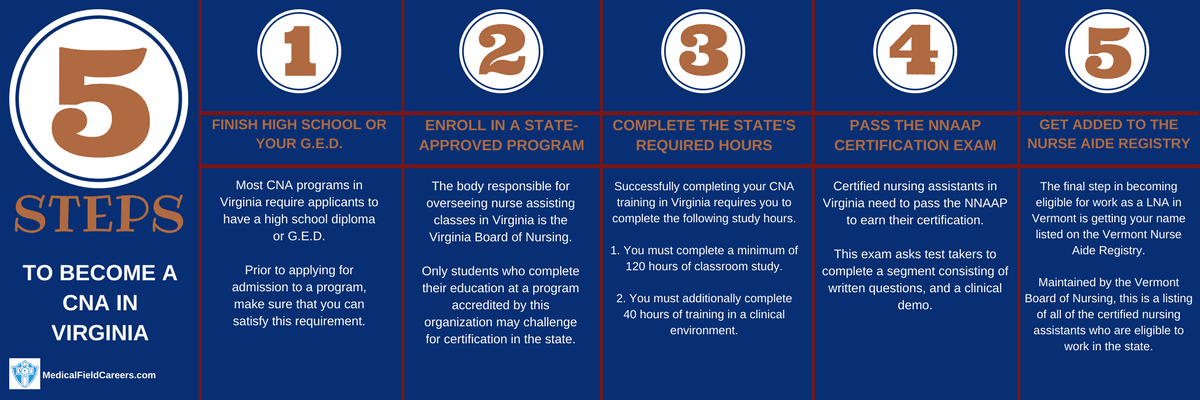 If you do complete a Virginia Board of Nursing approved CNA training program you can then take the (NNAAP) National Nurse Aide Assessment Program. Programs approved by the VBN are listed below. See their website here, if you have any questions about the state regulations or training.