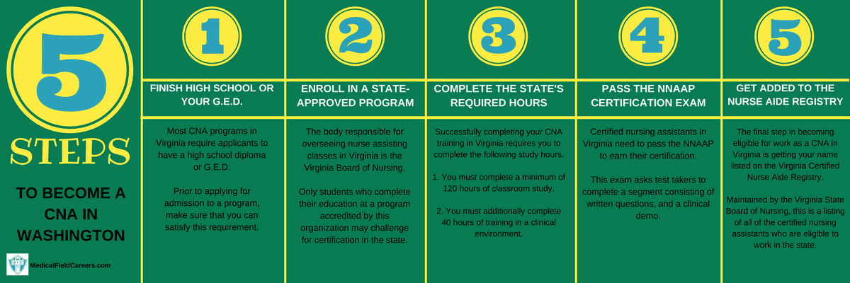 There is a training mandate in Washington State of at least 120 hours of training in a clinical environment, and 55 hours learning time in the classroom. This requirement must be met for the ability to get your CNA license in Washington.