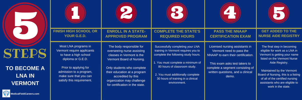 LNA programs in Vermont must be accredited by the Vermont Board of Nursing. To get your LNA certification or a chance to become a MNA in Vermont, you will have to finish accredited education in nurse assisting.