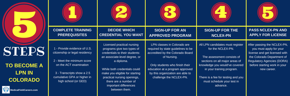 The process for becoming a LPN in Colorado can be summarized in the following 5 steps.