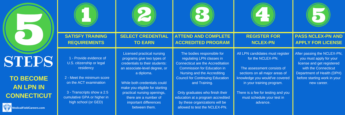 The process for becoming an LPN in Connecticut can be summarized in the following 5 steps.