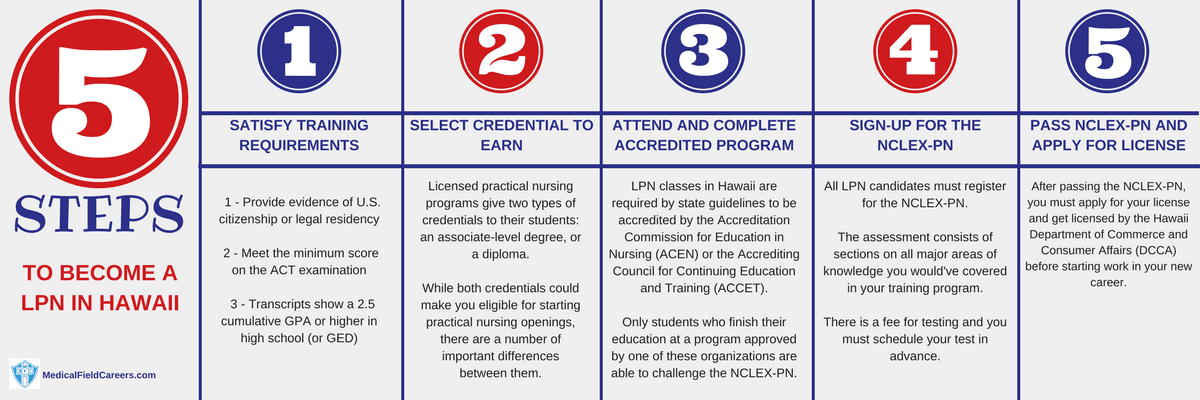 The process for becoming an LPN in Hawaii can be summarized in the following 5 steps.
