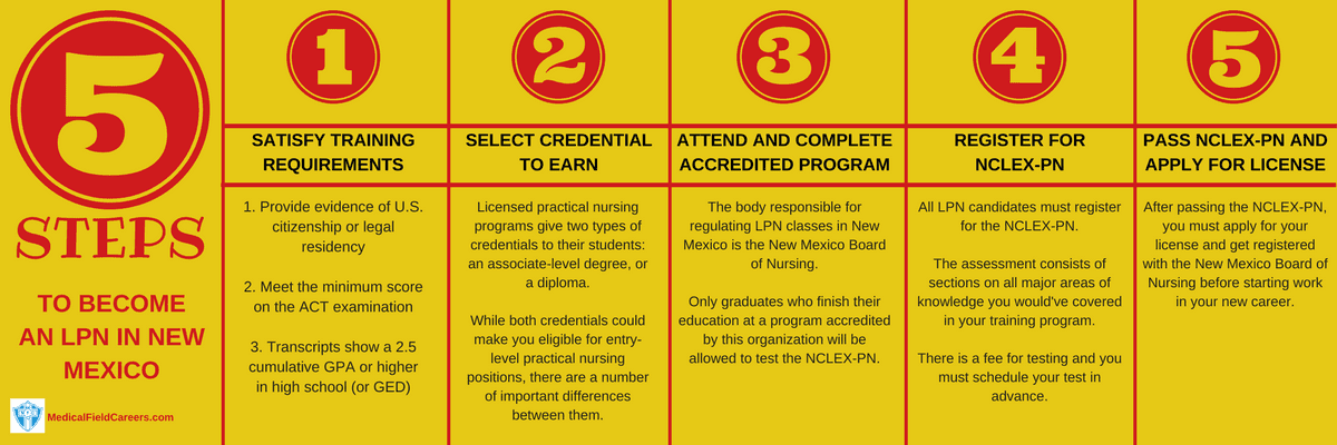 The steps to become an LPN in New Mexico is shown below in detail in the following 5 steps.