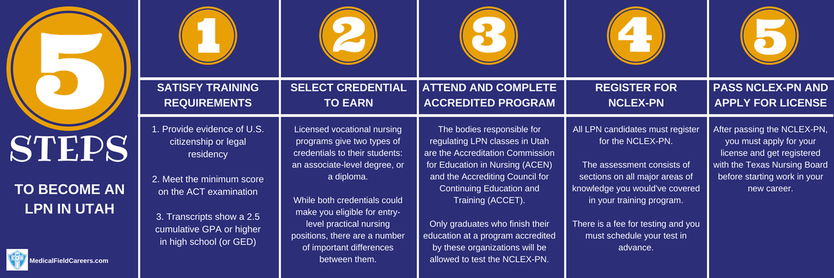 The steps in the process for becoming an LPN in Utah are listed below.