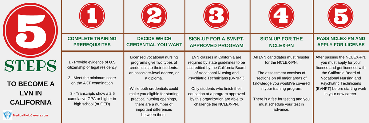 The process for becoming an LVN in California can be summarized in the following 5 steps.