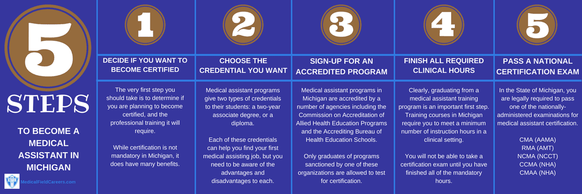 The (CAAHEP) and the (ABHES) are responsible foe approving programs in medical assisting across Michigan. If you want a certification, you will need to finish one of their approved courses in medical assisting.