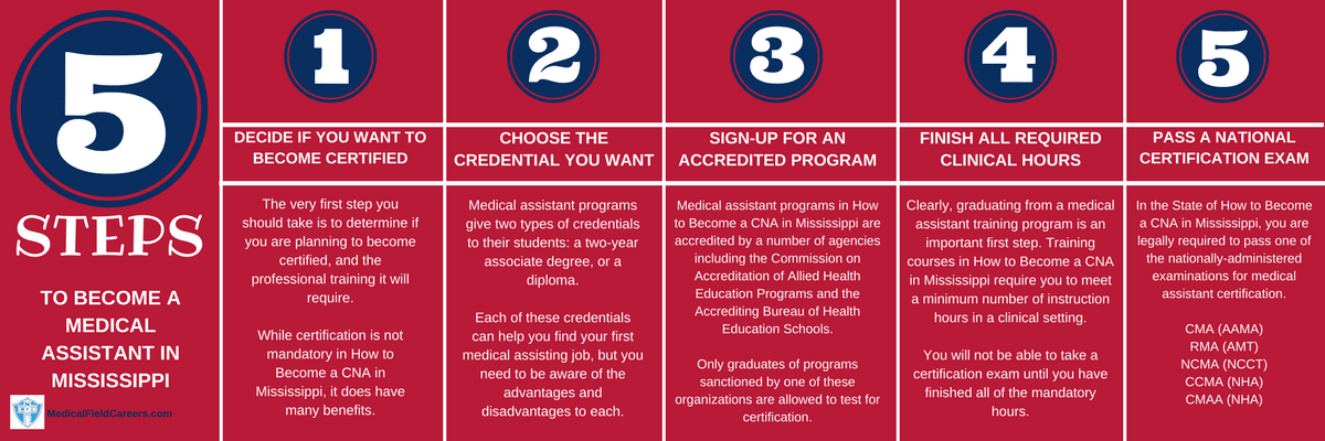 Becoming a medical assistant in Mississippi is summarized in the following steps below.