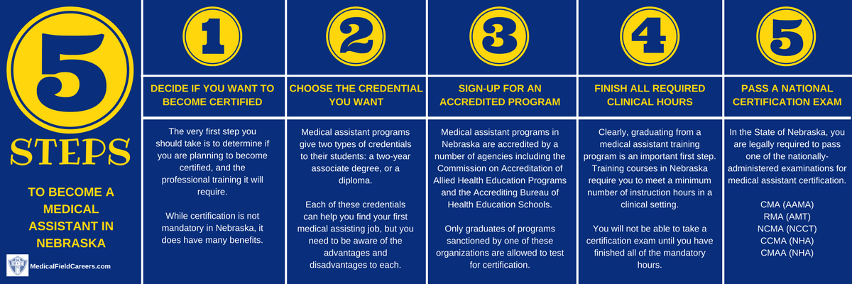 Students can connect with medical assistant schools in Nebraska that are accredited with our free resources!. You can find the perfect school in Nebraska at the right price, location and get the best medical assistant training. That is our goal with our latest article for you!Nebraska does not mandate certification for employment in medical assisting. It is important to also state that is most common for employers to hire certified medical assistants. There are offices that still do on the job training, but it is more common that offices are hiring medical assistants that are already trained, certified and ready to work.