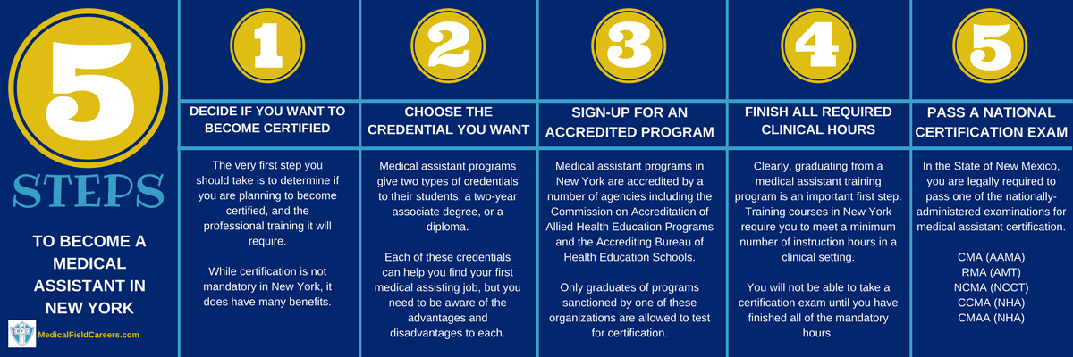 The process to become a medical assistant in New York requires the following five steps.