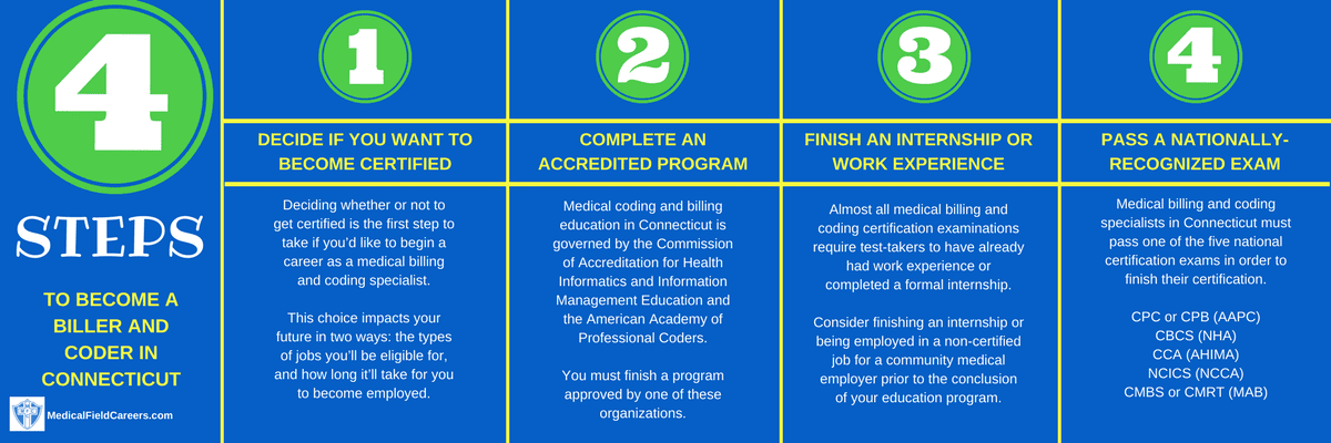 The process for becoming a medical biller or coder in Connecticut is summarized in the four steps listed below.