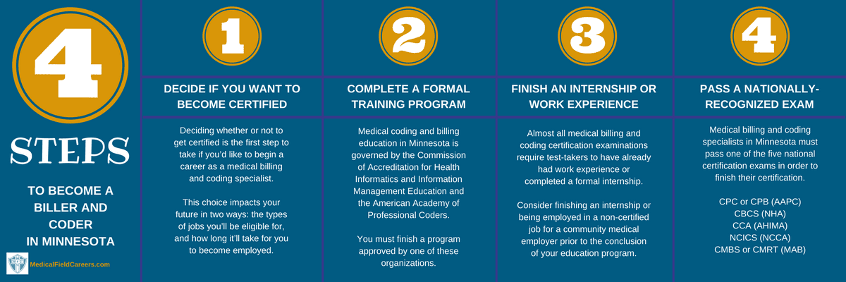 Becoming a medical biller or coder in Minnesota is shown in the steps below.